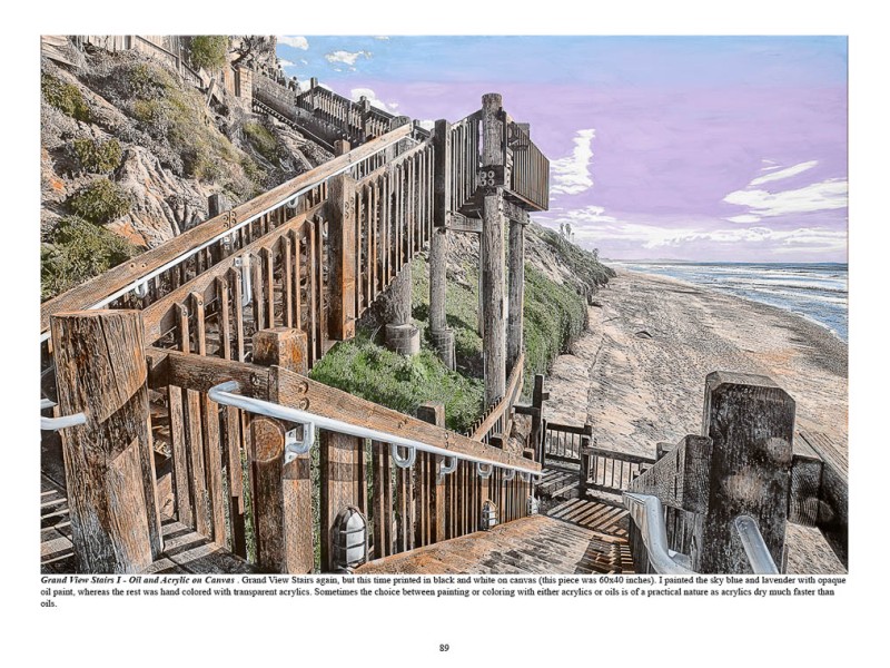 Each mixed-media photograph is accompanied by a brief description on what prompted me to focus on in each particular image, my choice of coloring, and often the rationale behind each exquisite composition. Since the first edition I've been working with additional media including oils on photo paper, oils on canvas, acrylics on canvas, watercolor on watercolor paper and pastel on matte paper.\
