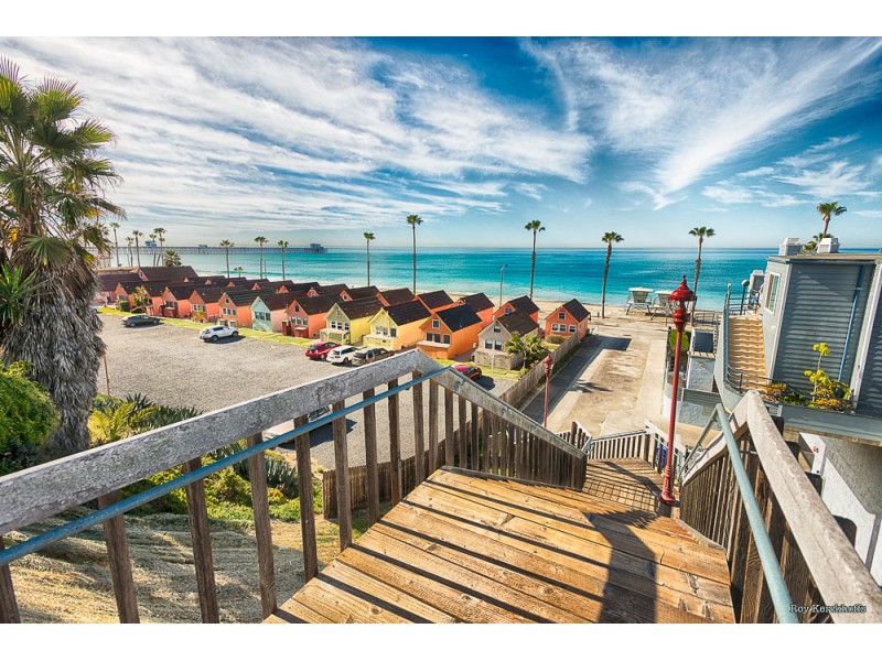 These cute little houses are called Robert’s Cottages and are located just north of the Oceanside Pier along The Strand North. They were built in the late 1920’s and can be rented for vacation stays. The front houses all have the same colors, but the ones at the back are colored differently. In this shot I also included the stairs and red lamp post.