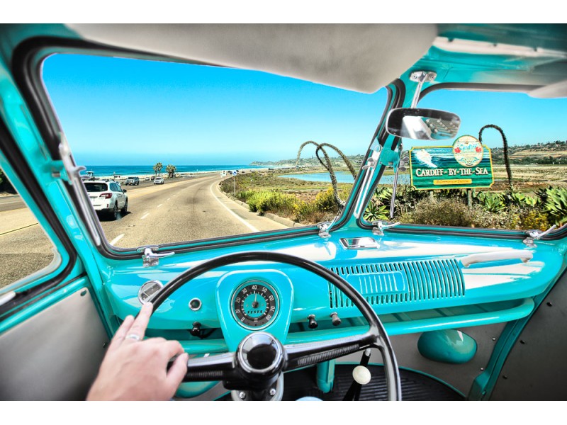 I’ve had this idea for a while where I’d photoshop a photo taken at a road into a photo from the inside of a 1960’s Volkswagen bus. In June 2019, when I was taking part in the Hermosa Beach Fine Arts Festival, I had the opportunity to take some photos from within a 1960’s Volkswagen bus, that was parked close to my booth. I took the background photo of driving down Highway 101 from Solana Beach to Cardiff-by-the-Sea and combined it with the VW interior shot.