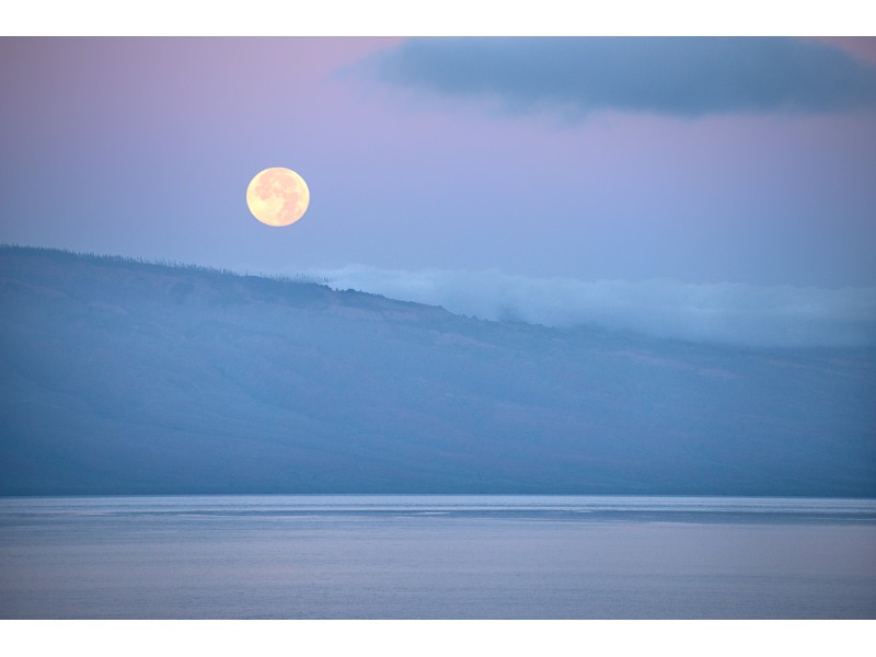 A beautiful full moon setting with blues and purples over the island of Lanai as seen from Maui, HI.
