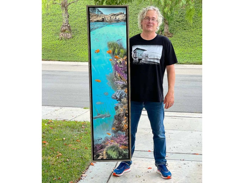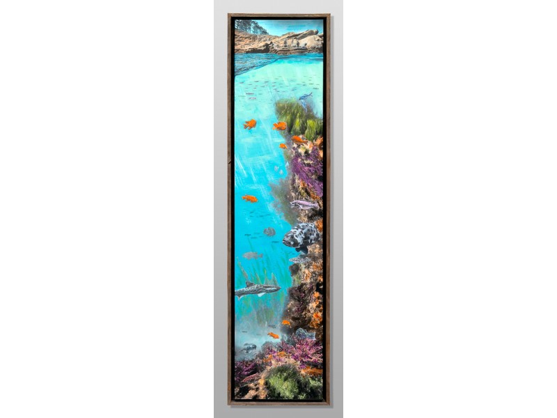 This work is a composite of 36 black and white photographs, taken mostly during snorkeling at the La Jolla Cove and some at the Birch Aquarium. Some of the animals included are sea lions on the bluffs, adult and baby Garibaldi, stingray, small and large seabass, spiny lobster, sardines, leopard shark, California sheephead, Pacific seahorse and white perches.
