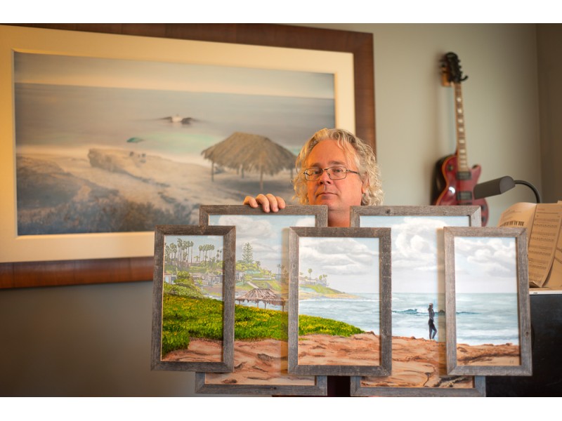 “Windansea Surfer and Shack”, an oil painting as an overlapping five-piece of the La Jolla Windansea shack, single wave and surfer girl standing on the shore taking it all in.