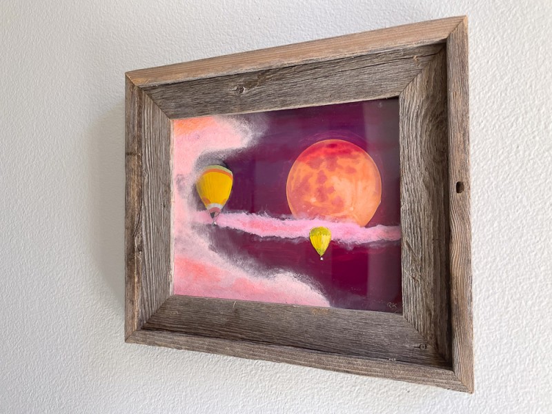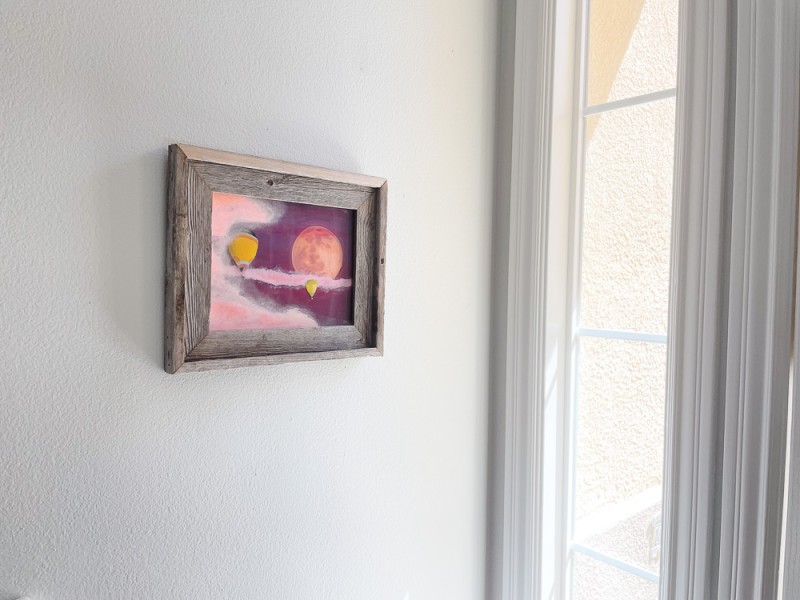 The moon and background are painted on the very back, the little balloon and long cloud on the front of that piece of plexiglass. On the most front piece of plexiglass - they are separated with spacers - I painted the larger balloon on the back and the largest cloud on the front. This gives actual depth to the painting.