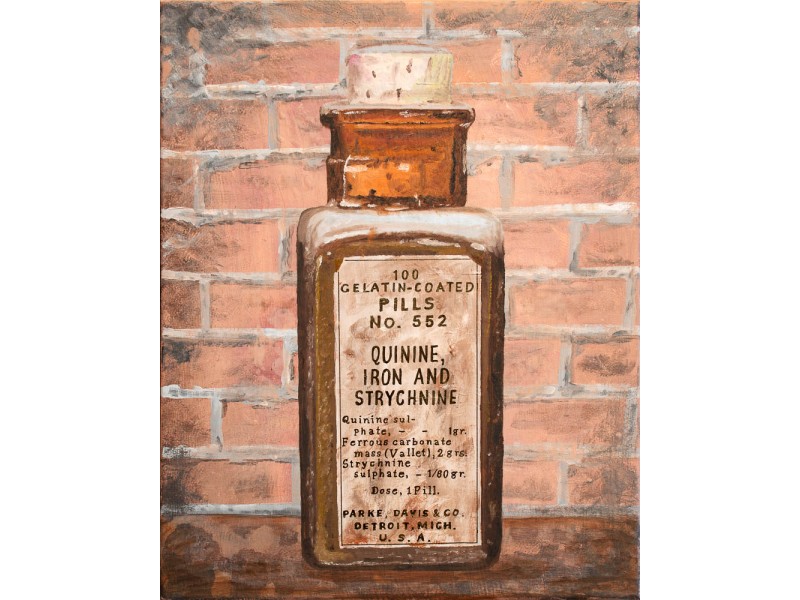 This 16"x20" acrylic (background) and oil (bottle) painting on stretched canvas is unframed. A wire is attached to the back.