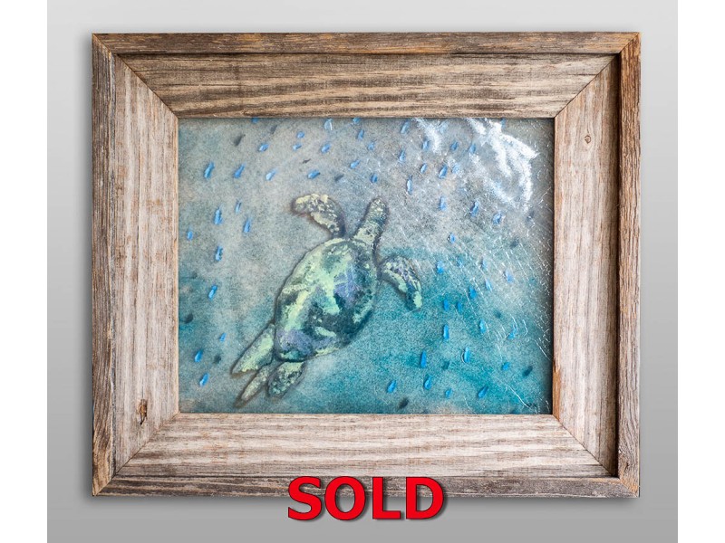 This is a small painting (8"x10") of a green sea turtle on two pieces of plexiglass. The bottom piece has sand attached to it (from a Carlsbad beach) on the back. On the front of that piece I painted the green sea turtle with oils and some fishes. On the back of the front piece I painted in blues with Marshall Photo Oils (a transparent oil) and on the front of that piece I painted on an acrylic gel in the shape of waves (and you can feel the texture). On the thickest waves I added some white.
