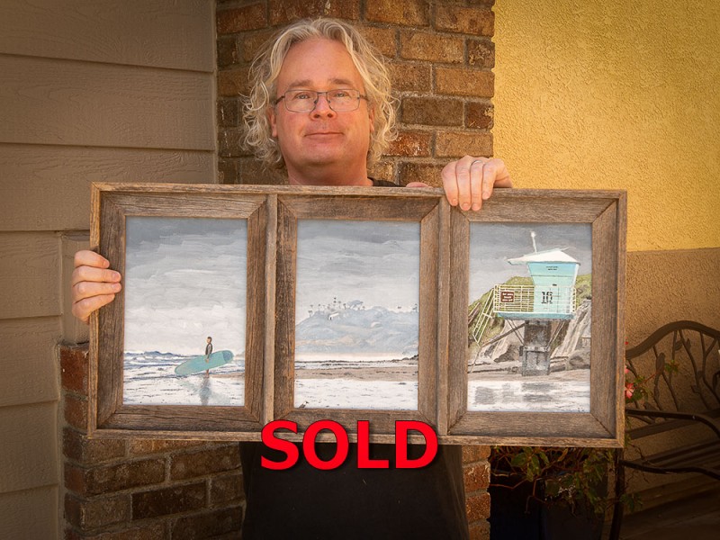 This is an oil painting triptych (with three 8x12" panels) of a stand up paddle boarder next to lifeguard tower 16 at San Elijo State Beach with Swami's Point in the background, framed in rustic barn wood frame
