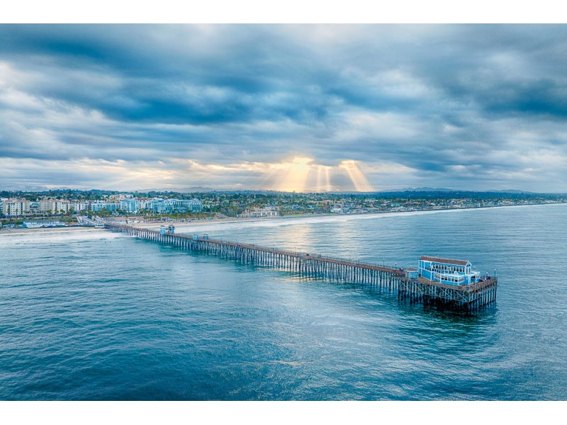 This is the Oceanside Pier in Oceanside, California, at a beautiful Sunday morning when the sun peeked through the clouds.