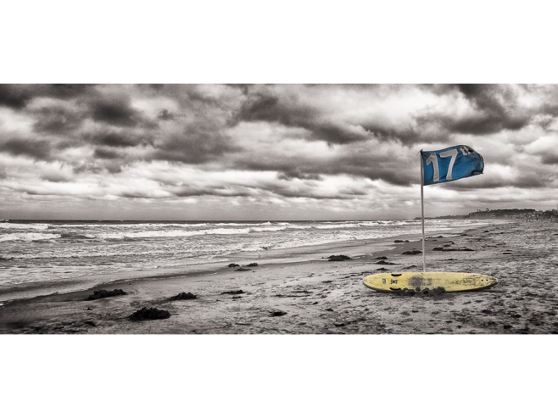 "17th St" is a hand-colored photograph by artist Roy Kerckhoffs. The scene is a stormy, overcast beach in Del Mar, California. A "17th" flag on a buoy rests on the beach sand. The image is in black and white with pops of yellow and blue.