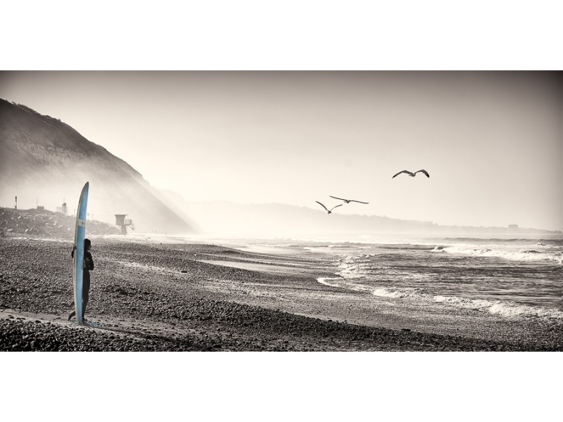 Tags: Pacific Ocean, beach, surfer, female, girl, cliffs, fog, mist